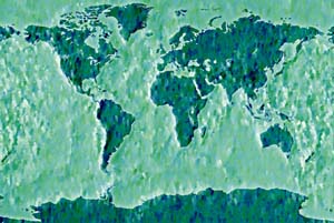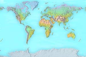 Pale green & brown land - mottled blue ocean